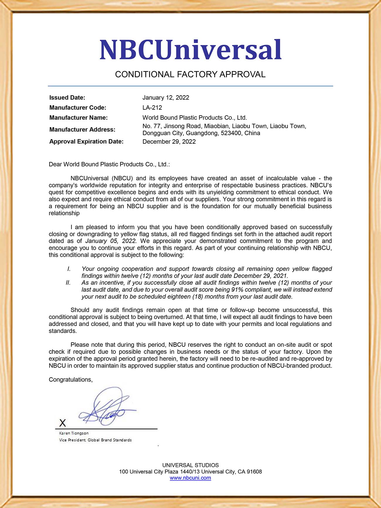 東莞市世邦塑膠制品有限公司玩具事業(yè)部隸屬于世邦集團(tuán),廠房面積27000平方米,我們有BSCI和SEDEX驗(yàn)廠報(bào)告,NBCU環(huán)球認(rèn)證,并通過(guò)WALMART, TARGET, HOMEDEPOT, DISNEY等大型美國(guó)商超認(rèn)證,已取得IETP、3C、GSV、ISO9001、SCAN、ICTI、SMETA等多種合格證書(shū)。主要產(chǎn)品有模具、玩具、電器配件、醫(yī)療器械配件、家電類(lèi)配件、電子產(chǎn)品、小家電、寵物用品,為高端品牌提供從產(chǎn)品設(shè)計(jì)、精密模具制造、注塑成型與組裝、售后服務(wù)為一體整套解決方案。有迪士尼授權(quán)認(rèn)證,目前為多個(gè)國(guó)家和海內(nèi)外知名企業(yè)提供禮品定制服務(wù)、代工生產(chǎn)服務(wù)、并成為長(zhǎng)期的合作伙伴,(如:日本萬(wàn)代、迪士尼、epoch等品牌合作) 世邦集團(tuán)成立于2002年,以智能制造,精密制造為核心,運(yùn)用合作共建,共享,共贏的模式,整合制造上下游供應(yīng)鏈,優(yōu)化全產(chǎn)業(yè)鏈,成為設(shè)計(jì)與創(chuàng)新,服務(wù)與生產(chǎn)為一體的智能智造企業(yè)集團(tuán)。 世邦集團(tuán)旗下設(shè)有8家制造工廠,遍布于東莞、廣州、深圳和越南;2家研發(fā)中心,分布于上海和香港。擁有精密模具制造車(chē)間、無(wú)塵注塑生產(chǎn)車(chē)間、無(wú)塵表面處理車(chē)間。擁有CNC、鏡面火花車(chē)間、各類(lèi)大中型注塑生產(chǎn)線(xiàn)及壓鑄、精密吹塑生產(chǎn)線(xiàn)、環(huán)保真空飛鋁鍍膜生產(chǎn)線(xiàn)、全自動(dòng)噴油生產(chǎn)線(xiàn)、邦定、SMT貼片、智能COB固晶生產(chǎn)線(xiàn)等數(shù)百臺(tái)先進(jìn)制造設(shè)備。